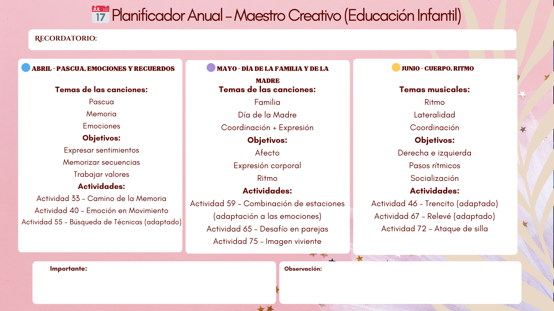 Sugerencias prácticas para usar las canciones a lo largo de la semana. Ejemplo: lunes, canciones de movimiento; martes, canciones de letras; miércoles, canciones de vocales… 👉 Facilita tu planificación semanal y asegura clases musicales más organizadas, dinámicas y efectivas.